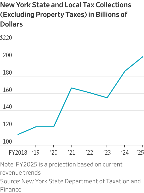 New York city and state are rolling in tax revenue thanks to hefty capital-gains realizations and Wall Street bonuses. City revenue has doubled and state tax revenue (excluding property taxes) is up two-thirds since 2019. Yet tax collections haven’t kept pace with political spending and government-worker benefits. The city faces a $5 billion shortfall, according to Mr. Mamdani.