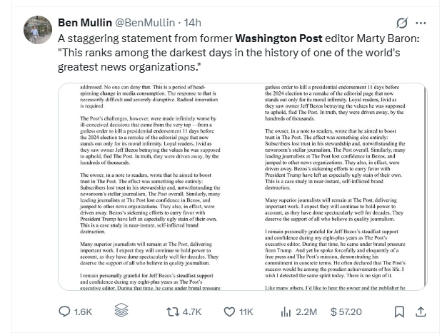 Baron posted on X: “The layoffs at The Post are a deep disappointment. The paper is losing journalists of great talent and dedication. I wish them all the very best.”