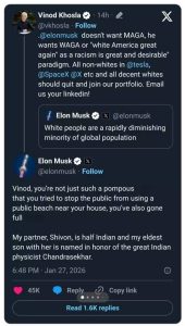 Elon Musk has called out venture capitalist Vinod Khosla for his comments about not voting for “any white man over 70,” labeling the statement as racist and countering with a personal connection to India.