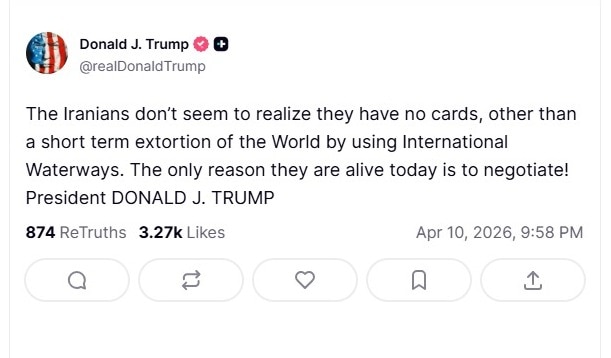 US President Donald Trump on Friday issued a stark warning to Iran in his latest Truth Social post, saying Tehran had “no cards” left and was relying only on “short term extortion of the world” through control of key international waterways.
