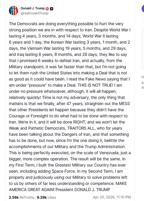 “Despite World War I lasting 4 years, 3 months, and 14 days, World War II lasting 6 years and 1 day, the Korean War lasting 3 years, 1 month, and 2 days, the Vietnam War lasting 19 years, 5 months, and 29 days, and Iraq lasting 8 years, 8 months, and 28 days,” Trump wrote, “they like to say that I promised 6 weeks to defeat Iran.”