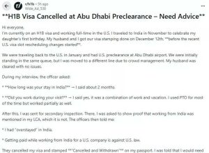 A Redditor on an H-1B visa claimed that her passport was stamped ‘cancelled and withdrawn’ at Abu Dhabi preclearance as she was traveling back to the US in January, along with her husband. Explaining her case, she said that she traveled to India in November to celebrate her daughter’s first birthday and did not face the H-1B stamping delay as their appointment dates were before December 15, 2025 — before the visa chaos started.