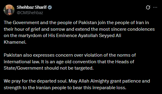 • Pakistan Prime Minister Shehbaz Sharif said the government and people of Pakistan stand with Iran in grief over the killing of Supreme Leader Ayatollah Seyyed Ali Khamenei, offering condolences. In a post on X following violent unrest across the nation, he also voiced concern over attacks on US consulates and UN office, calling it a violation of international law.