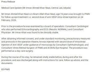 A medical board including cardiology and internal-medicine specialists first assessed Khan and declared him clinically stable, with normal cardiac tests, before the ophthalmic procedure was carried out as day-care surgery by retinal surgeons from PIMS and Al-Shifa Eye Hospital, according to an official hospital statement.