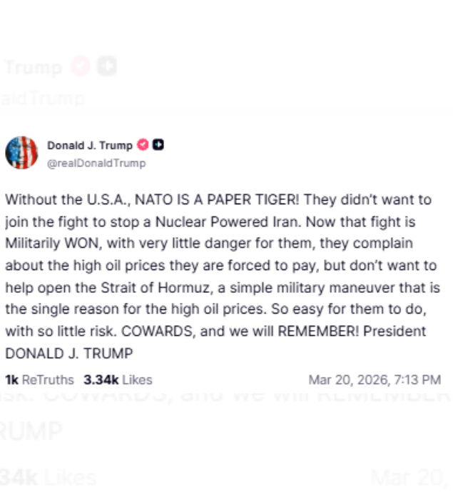 “Without the U.S.A., NATO IS A PAPER TIGER! They didn’t want to join the fight to stop a Nuclear Powered Iran. Now that fight is Militarily WON, with very little danger for them, they complain about the high oil prices they are forced to pay, but don’t want to help open the Strait of Hormuz, a simple military maneuver that is the single reason for the high oil prices. So easy for them to do, with so little risk. COWARDS, and we will REMEMBER!” said Trump.