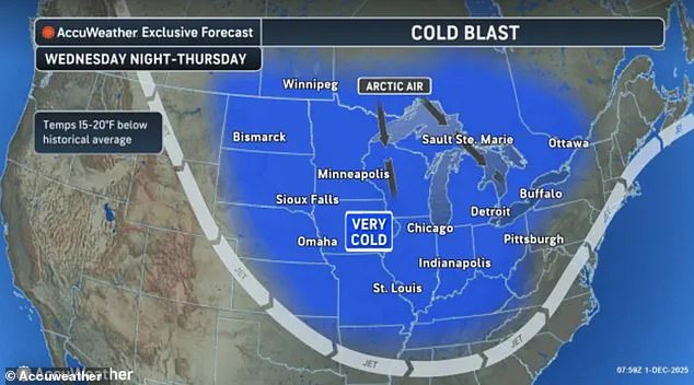 AccuWeather warns temperatures in at least 20 states could fall up to 20 degrees below historical averages for early December. Iowa may see lows below -10°F on Thursday, breaking records held for decades. By Friday, record lows in the teens and 20s are forecast for , Chicago, Indianapolis, and Baltimore.