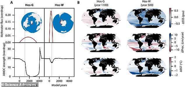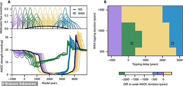 ‘Greenland melt generally destabilises the AMOC, whereas, as we have shown, West Antarctic Ice Sheet’s melt may, under certain conditions, stabilise it,’ Dr Sinet told the Daily Mail.