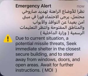 In both Arabic and English, the alert was issued by the Ministry of Interior (MoI) and advised residents to seek immediate shelter in the closest secure building, to keep away from windows and open areas and to await further instructions from official authorities.