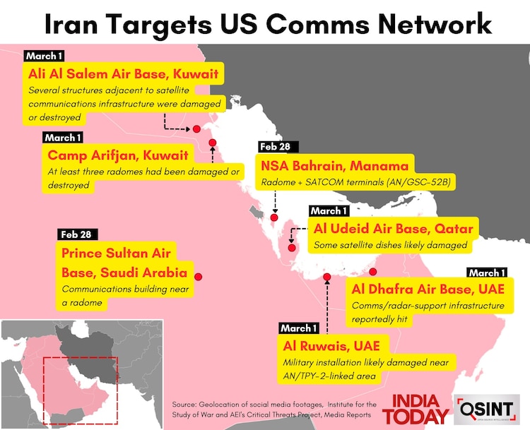 An examination of these claims by India Today’s Open Source Intelligence (OSINT) team, using satellite imagery, geolocation data, and publicly available assessments, indicates visible damage to structures linked with radar domes, satellite communication terminals, and related support infrastructure at several Gulf-based facilities.