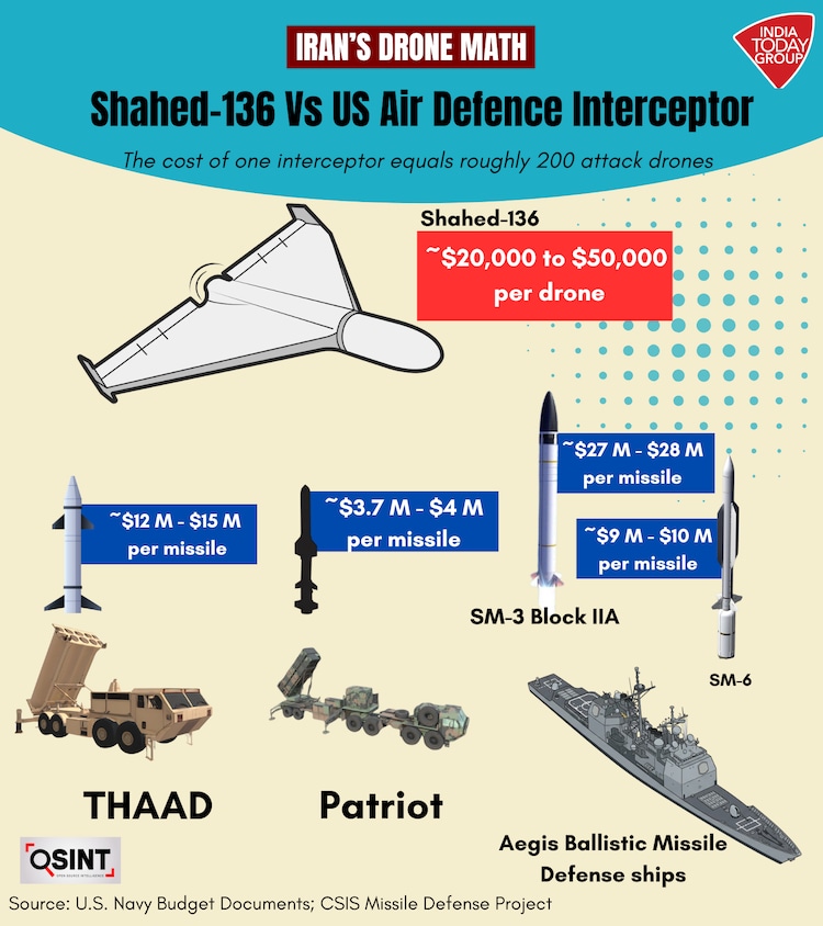 In Indian currency, a Shahed-136 costs roughly Rs 18–Rs 46 lakh each, letting Iran fire them in large numbers. But shooting them down can cost tens to hundreds of crores per interceptor: about Rs 34–37 crore (Patriot), Rs 110–Rs 137 crore (THAAD), Rs 82–Rs 92 crore (SM-6), and as high as Rs 247–RS 256 crore (SM-3).