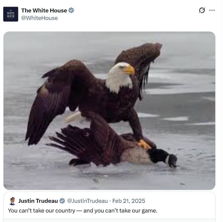 “You can’t take our country — and you can’t take our game,” Trudeau had tweeted on February 21 last year. After the United States defeated Canada in the dramatic gold-medal clash, the White House responded with a cheeky post showing a bald eagle preying on a Canadian goose.