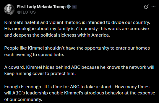 Melania Trump also accused Kimmel of promoting division and hostility. In a post on X, she said, “Kimmel’s hateful and violent rhetoric is intended to divide our country. His monologue about my family isn’t comedy- his words are corrosive and deepens the political sickness within America.”