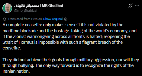 “A complete ceasefire only makes sense if it is not violated by the maritime blockade and the hostage-taking of the world’s economy, and if the Zionist warmongering across all fronts is halted; reopening the Strait of Hormuz is impossible with such a flagrant breach of the ceasefire,” he wrote.