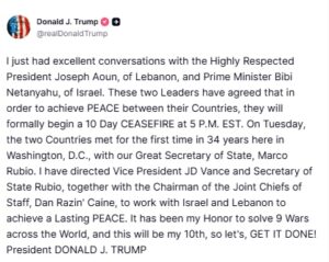 In a separate post, Trump said he plans to invite Netanyahu and Aoun to the White House for the first meaningful talks between Israel and Lebanon since 1983. “I will be inviting the Prime Minister of Israel, Bibi Netanyahu, and the President of Lebanon, Joseph Aoun, to the White House for the first meaningful talks between Israel and Lebanon since 1983,” he said, adding, “Both sides want to see PEACE, and I believe that will happen, quickly!”