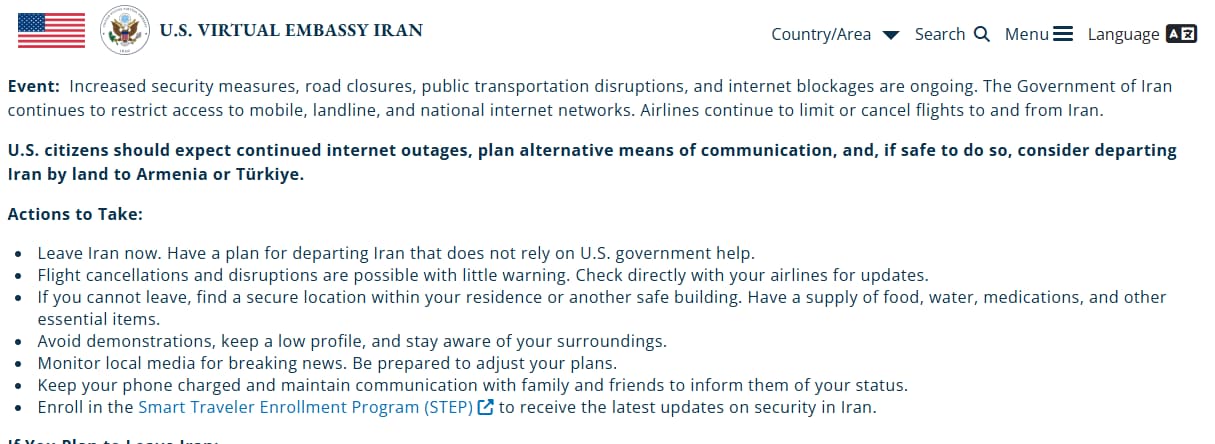 Earlier on February 6, the US Virtual Embassy Iran said, “U.S. citizens should expect continued internet outages, plan alternative means of communication, and, if safe to do so, consider departing Iran by land to Armenia or Türkiye.”