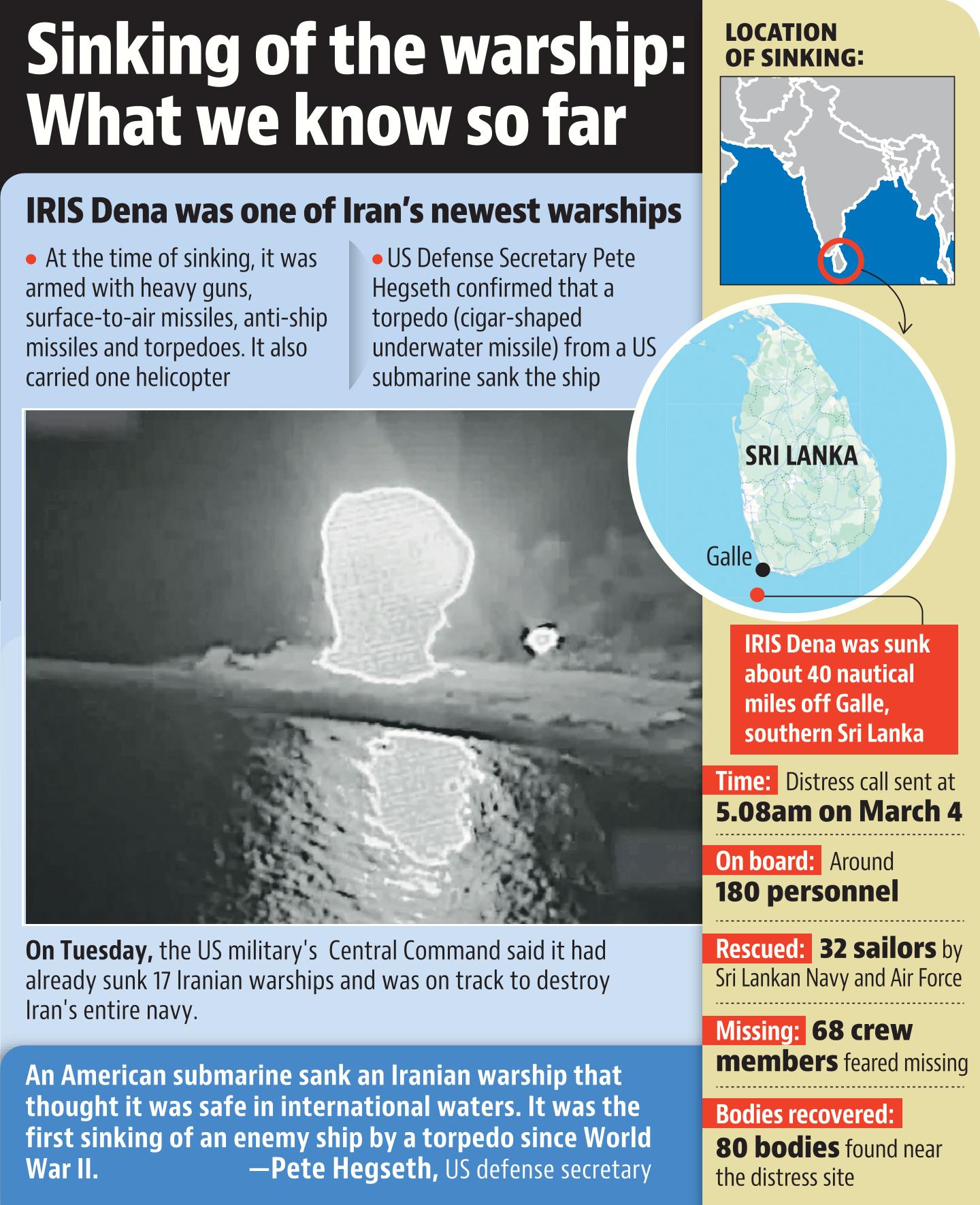 US defense secretary Pete Hegseth confirmed at a media briefing in Washington that the Iranian frigate had been sunk by the US, hours after Sri Lankan officials said the warship was targeted in a submarine attack. The Sri Lankan Navy said it rescued 32 people after it received a distress call while defence secretary Sampath Thuyyakontha told BBC Sinhala 80 bodies had been found.