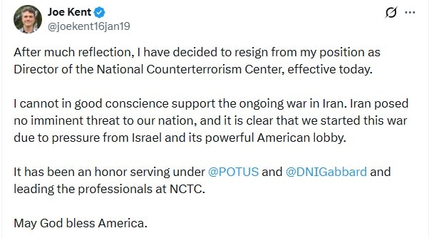 Joe Kent, director of the US National Counterterrorism Center, has resigned from the administration of Donald Trump, citing his opposition to the US’ war with Iran and saying he could not support the conflict. He claimed that America did not need this war, but started it due to pressure from Israel.