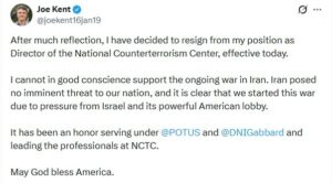 Kent announced his resignation on Tuesday, stating that he “cannot in good conscience” back the administration’s military campaign against Iran.