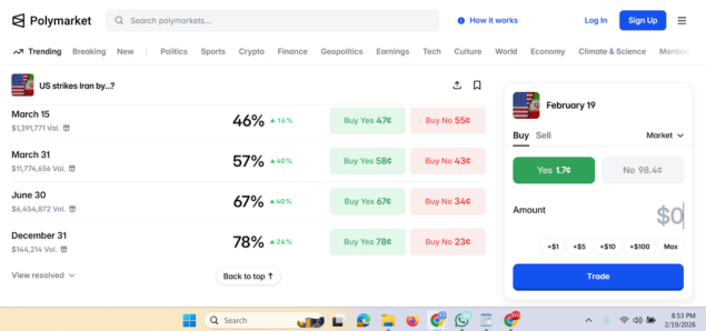 These markets — which have seen hundreds of millions of dollars wagered on whether a strike will occur — suggest traders are pricing in an increasing chance of military action as diplomatic talks falter and US forces build up in the region. By comparison, the chances priced for an attack by February 28 were significantly lower, reflecting the idea that if strikes happen, they may be more likely in March or later.